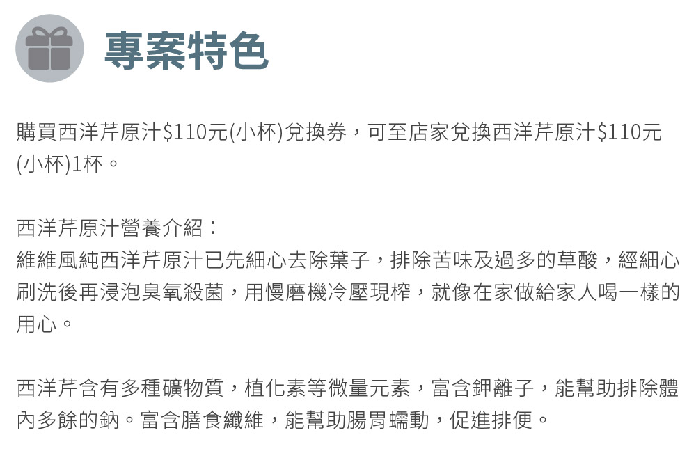 1. 可兌換西洋芹原汁$110元(小杯)兌換券(MO)。