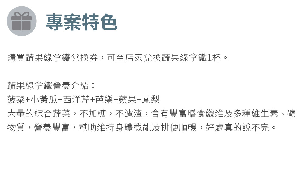 1. 可兌換蔬果綠拿鐵兌換券(MO)。