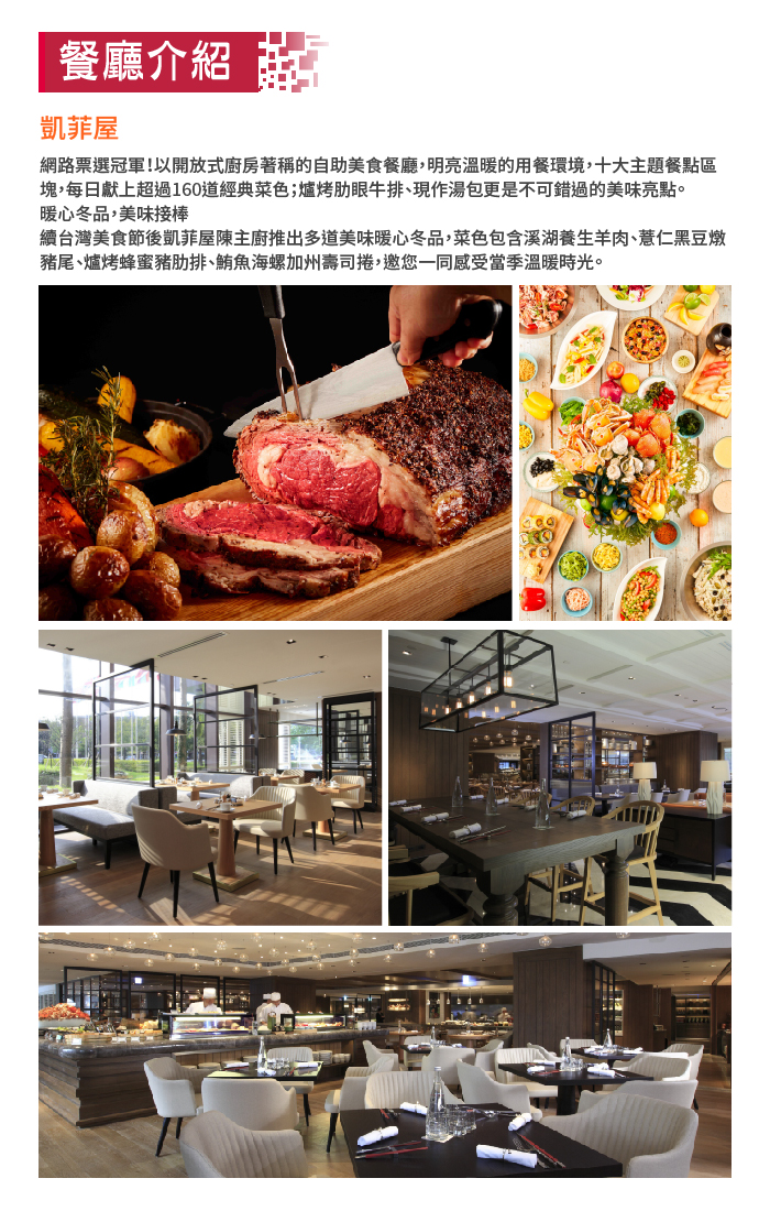 優惠內容:不限平假日憑本禮券可享一樓凱菲屋午間或晚間自助餐貳客或下午茶自助餐肆客
