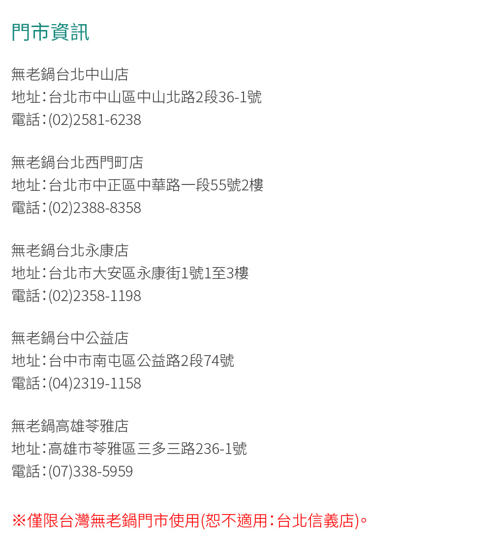 ※僅限台灣無老鍋門市使用(無老鍋台北信義店恕不適用)。