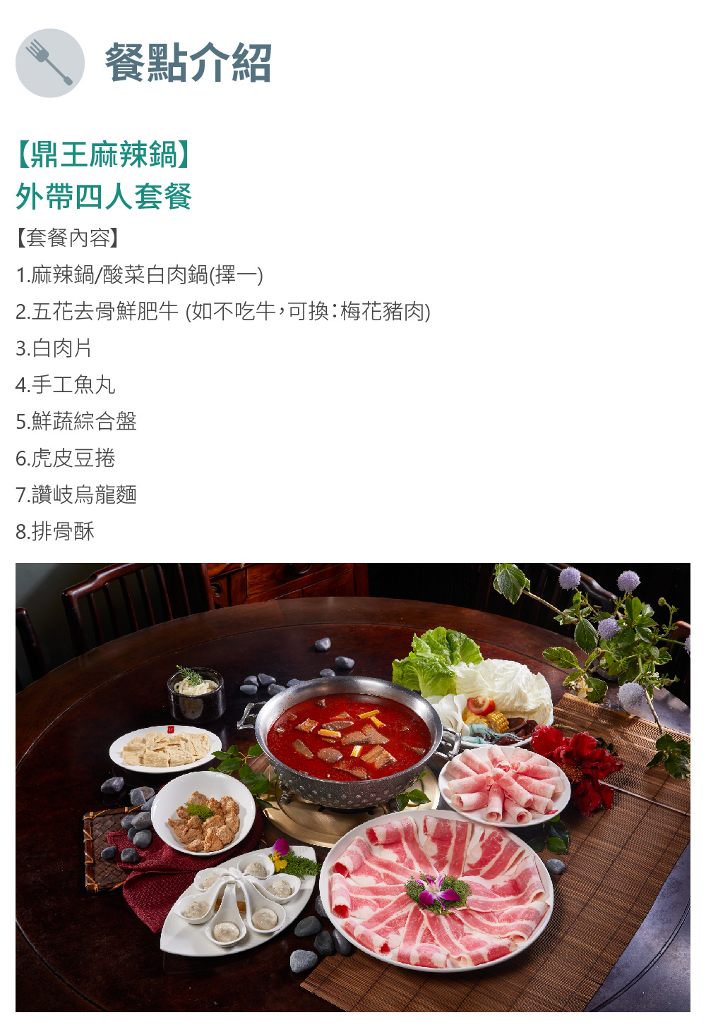 套餐內容:麻辣鍋/酸菜白肉鍋(擇一)、五花去骨鮮肥牛(如不吃牛,可換:梅花豬肉)、白肉片、手工魚丸、鮮蔬綜合盤、虎皮豆捲、讚岐烏龍麵、排骨酥。