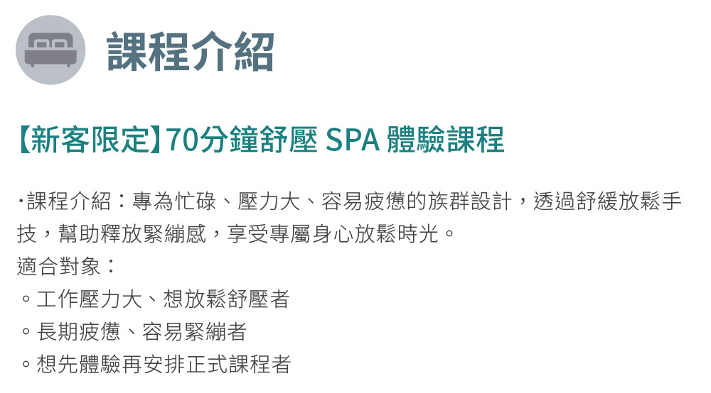 4. 本券課程內容包含「舒壓 SPA 課程 70 分鐘」。