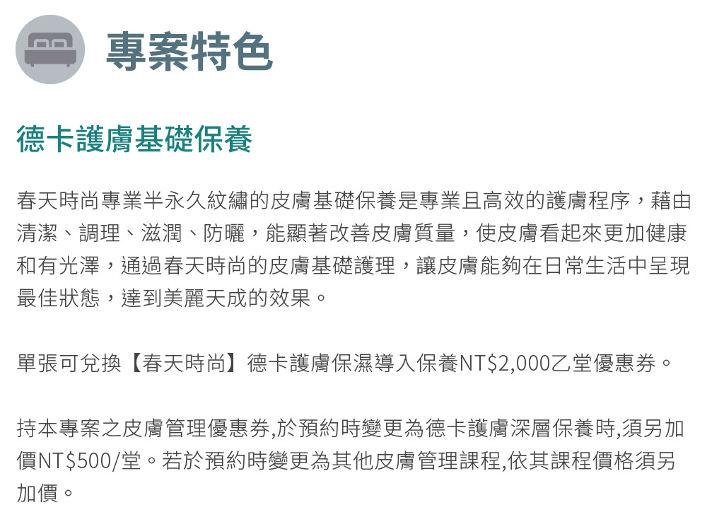 5. 持本專案之皮膚管理優惠券,於預約時變更為德卡護膚深層保養時,須另加價NT$ 500/堂。若於預約時變更為其他皮膚管理課程,依其課程價格須另加價。