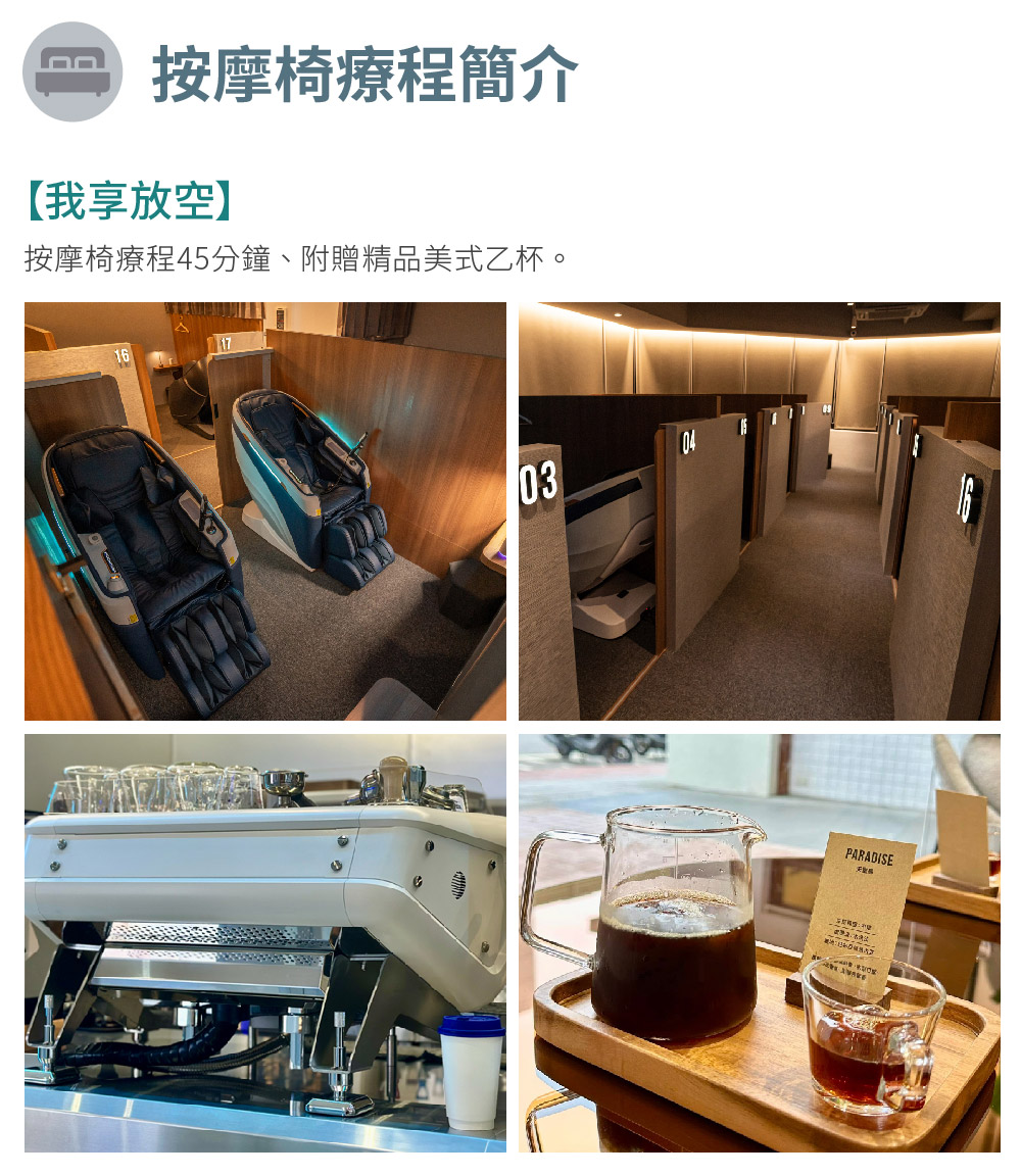 1. 本券限單人使用,可於【輝葉放空站】兌換按摩椅療程45分鐘附贈精品美式一杯。