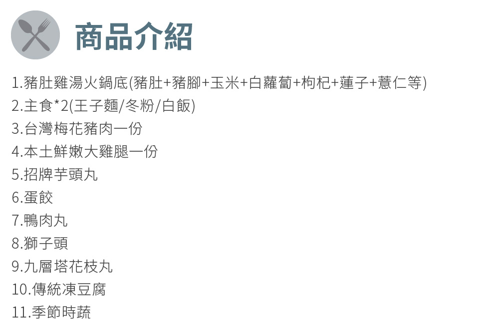 1.豬肚雞湯火鍋(豬肚+豬腳+玉米+白蘿蔔+枸杞+蓮子+薏仁等)